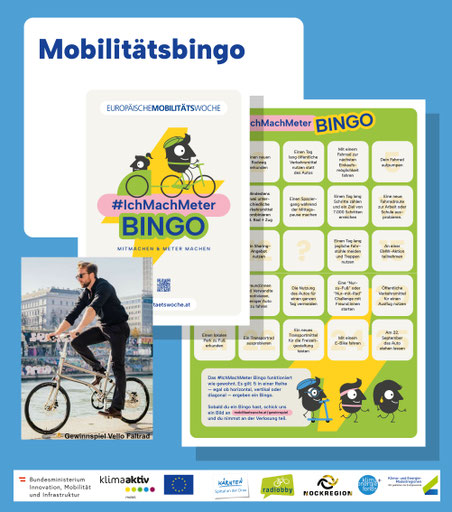Nehmt kleine Aufgaben rund um Öffis, Radfahren oder Zufußgehen in Angriff und versucht, fünf Felder in einer Reihe zu schließen – wie beim Bingo. Und wer mitmacht, hat außerdem die Chance ein tolles Vello Faltrad zu gewinnen.